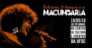 No dia 19 de maio o espetáculo Juliana D Passos e a Macumbaria irá se apresentar no Centro de Cultura e Eventos da UFSC. O evento é uma legítima exaltação da musicalidade africana e sua influência na cultura brasileira, tendo como pilar a religiosidade dos cultos de matriz afro, com a recriação de cânticos da cultura yorubá em ritmos de origem negra amplamente difundidos, como o soul, o reggae, o maracatu, o hip-hop.